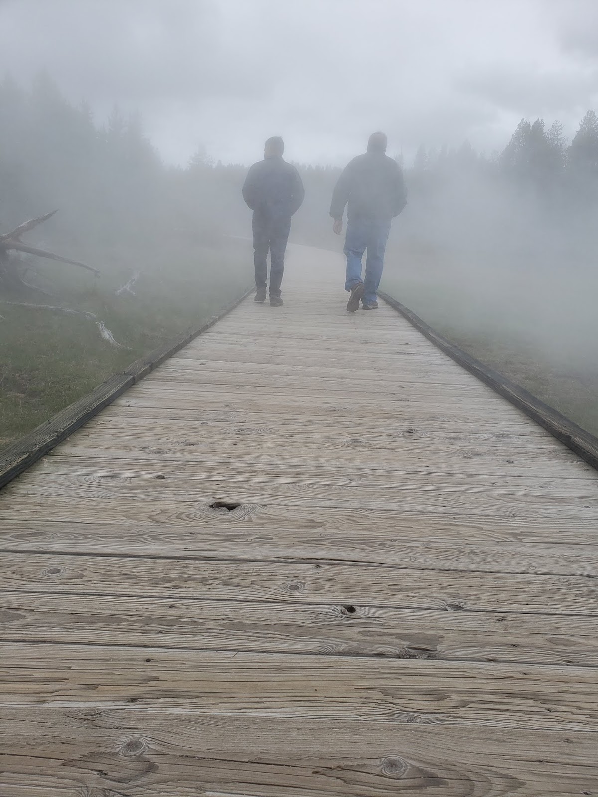 | Walking the boardwalk through the steam. |
